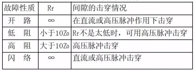 以上分類的目的也是為了選擇測試方法的方便,根據(jù)目前流行的故障測距技術,開路與低阻故障可用低壓脈沖反射法,高阻故障要用沖擊閃絡法測試,而閃絡性故障可用直流閃絡法測試?,F(xiàn)場人員有把Rf<100KΩ的故障稱為低阻故障的習慣,主要是因為傳統(tǒng)的