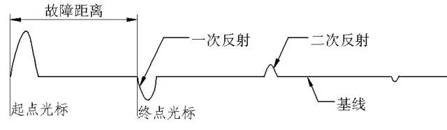 需要說明的是:當(dāng)故障距離或電纜長度較短時(shí),反射脈沖可能與基線沒有交點(diǎn),這時(shí),光標(biāo)起點(diǎn)、光標(biāo)終點(diǎn)就以波形上升或者波形下降的拐點(diǎn)來確定。